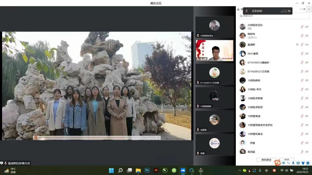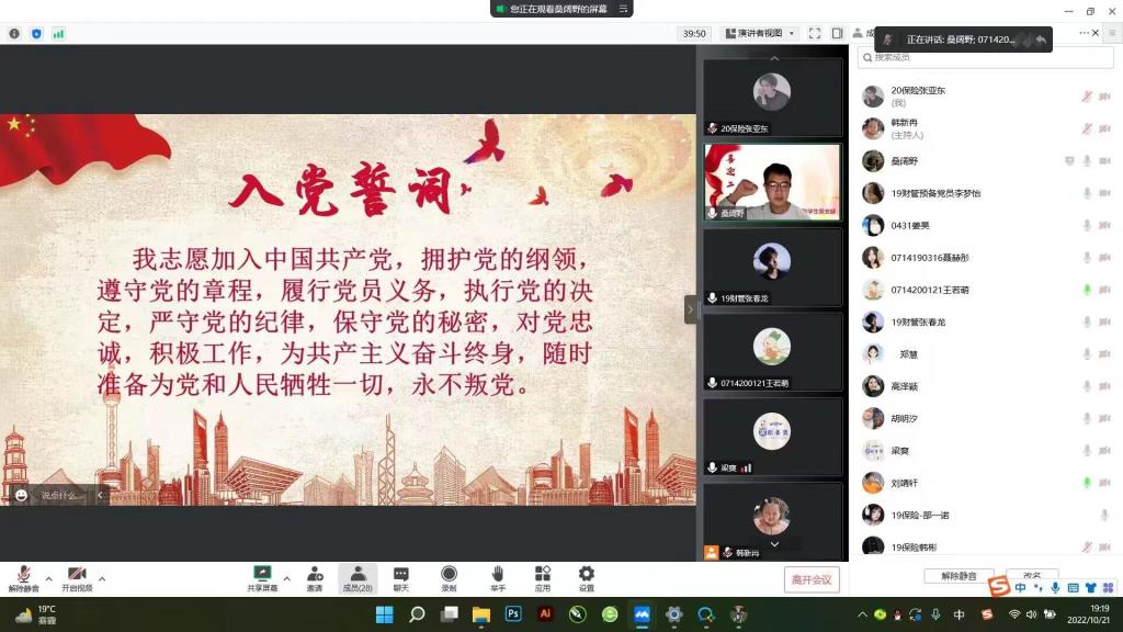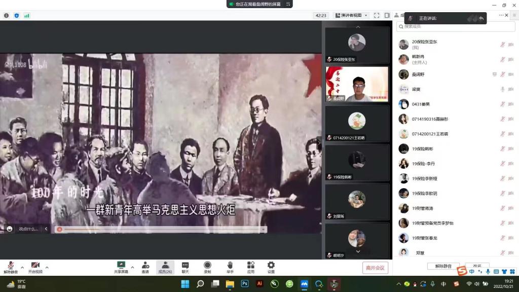 为聚力做好学习宣传贯彻党的二十大这项重要任务,团结引领支部党员坚定跟党走、建功新时代。财管保险党支部于2022年10月21日星期五晚7:00—9:00在线上腾讯会议开展了“学思践悟二十大,砥砺奋进新征程”主题党日活动,出席活动的有梁爽老师、郑慧老师,董硕玲老师,财管保险党支部全体党员。