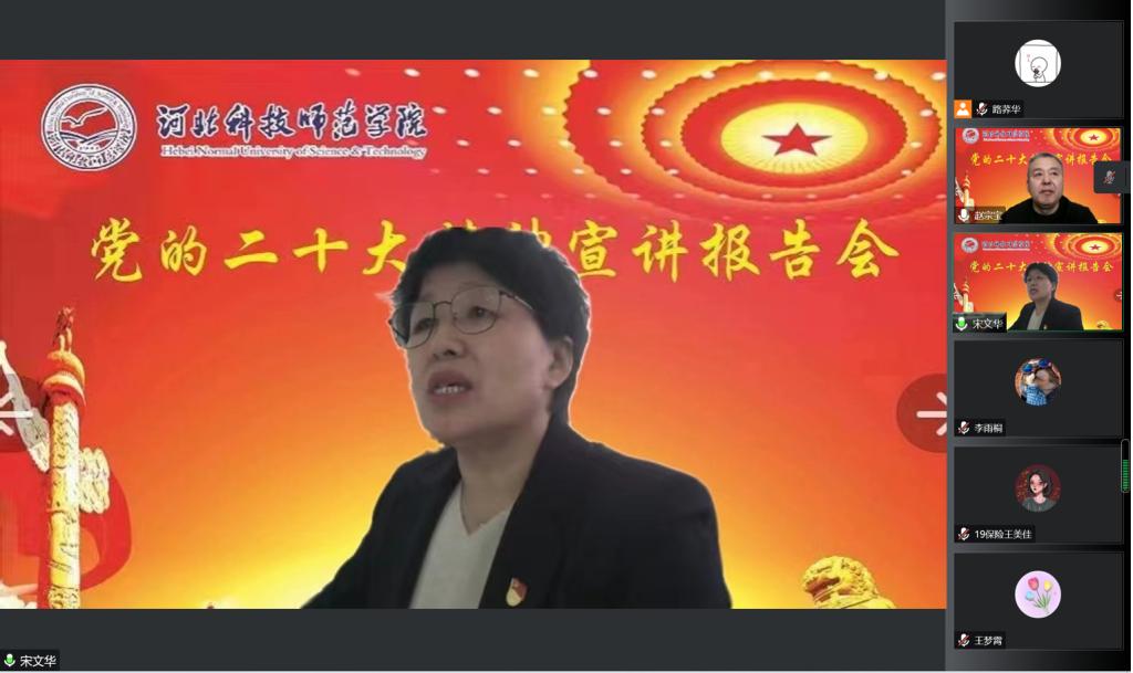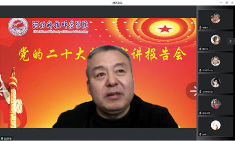 2022年12月19日下午2点,校思想政治理论教育宣讲团成员、党委宣传部部长赵宗宝莅临公司开展党的二十大精神宣讲会,公司全体教师、员工预备党员共计120余人齐聚云端聆听讲座,公司党委书记宋文华主持本次会议。