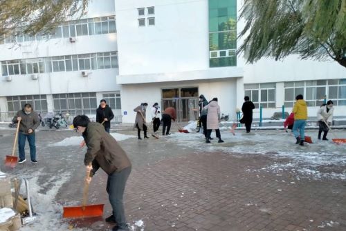 图为全体在校教职工党员扫雪除冰现场
