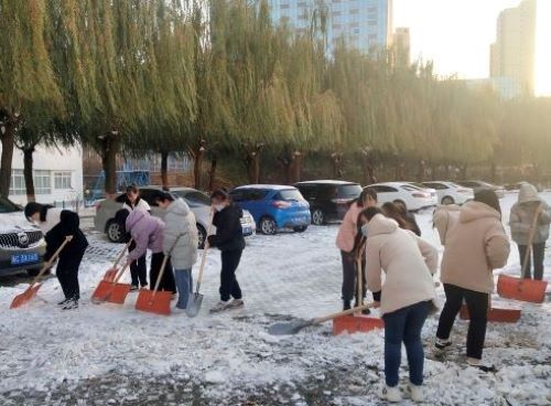 图为财会教育员工党支部党员扫雪除冰现场