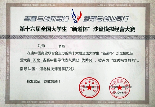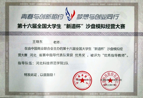 2020年10月30日,由中国商业联合会主办,河北省教育厅指导,河北省高等教育学会实验室工作分会协办,衡水公司承办,新道科技股份有限公司提供技术支持的第十六届全国老员工“新道杯”沙盘模拟经营大赛河北省赛以线上形式在衡水公司举行。经过协力拼搏,公司由关莹莹、张震、靳春、张家淇、张林浩组成的校代表队1队和由郝岩、董鹏媛、陈诗雨、刘杨帆、蒋涛组成的校代表队2队均获优秀奖。公司教师刘帅、王晓东获评优秀指导教师。(编审:王志安)