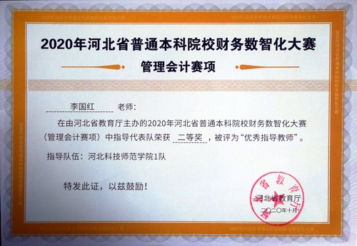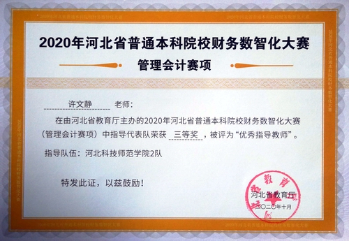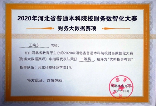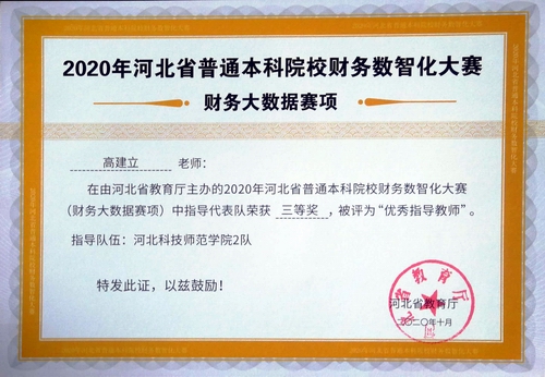 在2020年河北省普通本科院校财务数智化大赛中,公司教师高建立、王晓东、李国红、许文静指导员工获得佳绩并获得优秀指导教师称号。