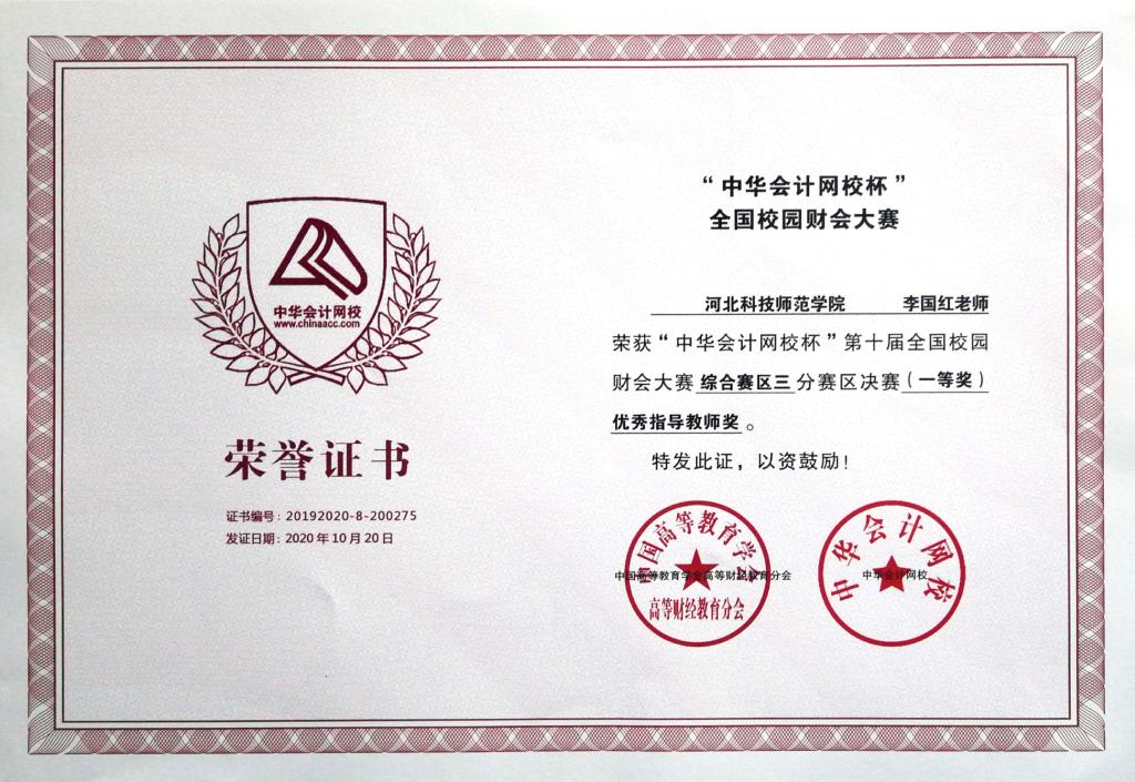 李国红、卢亚君、王晓东获第十届全国校园财会大赛优秀指导教师奖