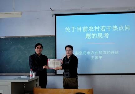 2014年10月21日下午,秦皇岛市农业局农经总站站长王国平研究员应邀来为公司做了题为《我国农村若干热点问题的思考》的专题报告。体育365官网农业推广硕士农村与区域发展领域的研究生和相关专业教师听取了报告。