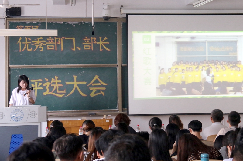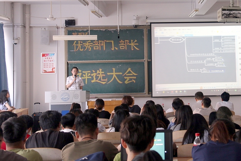王雪聪、池潞、裴云娇、黄一丁、王杨、程雨杭、周放、王奕斐八位优秀部长候选人依次上台汇报工作,交流工作经验和方法,畅谈心得体会。随后,八个部门负责人用思维导图、视频的多种形式从部门职能、部门活动、取得的成绩等方面汇报本部门工作,参评优秀部门。经过评选,王杨、裴云娇、王奕斐、王雪聪获评优秀部长,办公室、就业部、组织部、社团联合会获评优秀部门。