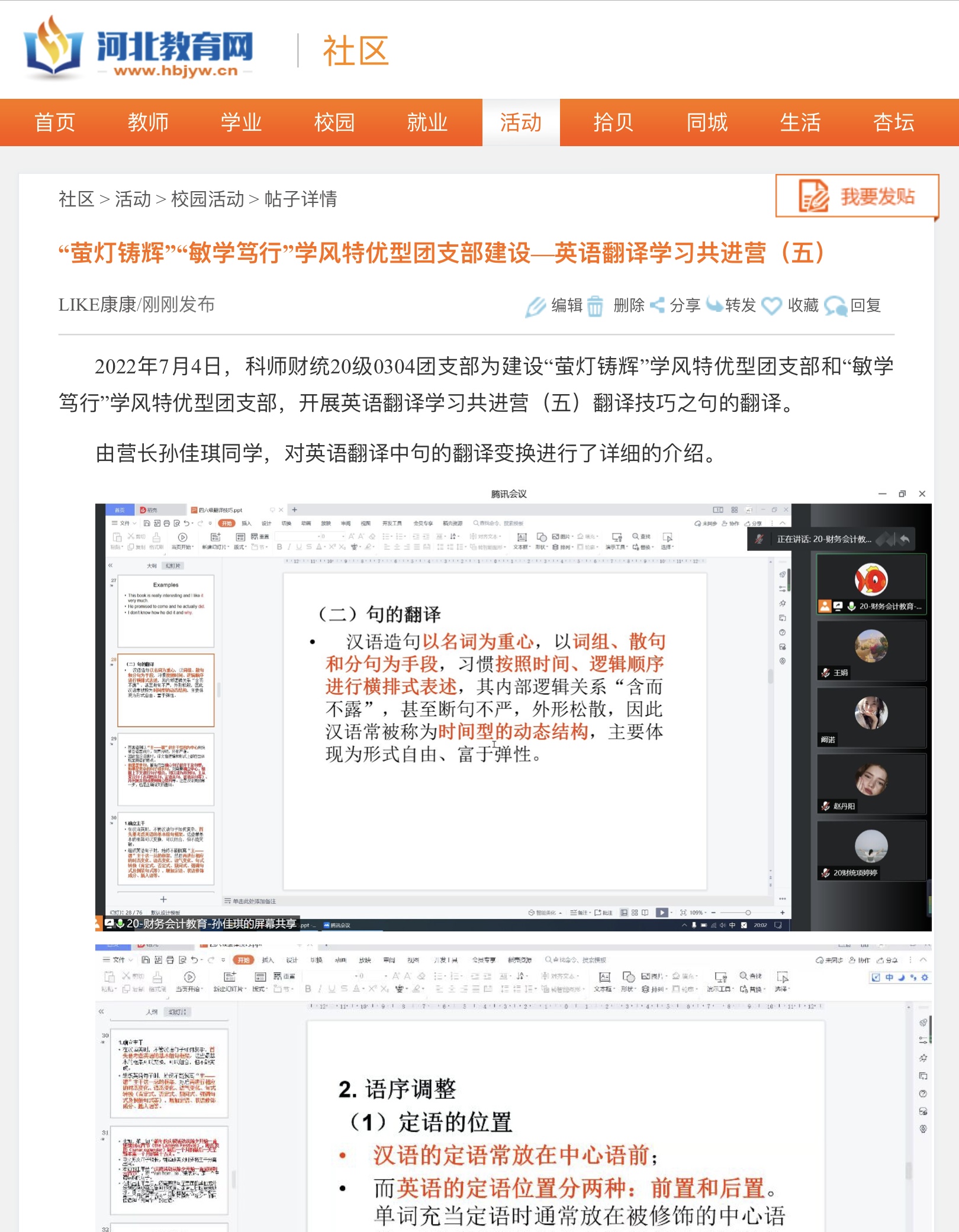 团支部于7月22日召开主题班会进行了阶段小结,辅导员肖艳老师针对四六级学习提出三点建议即明确英语学习的动力来源、要有清晰的目标、缓解英语四六级考试压力。肖老师作为英语写作学习训练营的营长对英语写作训练营的前期活动就活动形式与活动具体内容进行了小结。接下来各位营长刘绍婷、刘江曼、孙佳琪、丁栩慧、龙捷和薛子扬也分别对其训练营前期近两个月的活动进行了回顾和反思,并对接下来的活动顺利开展进行准备,共建学风特优型团支部。(编审:王志安)