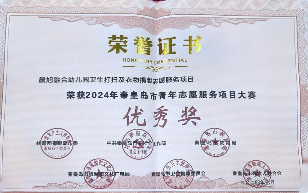 图为晨旭融合幼儿园卫生打扫及衣物捐赠志愿服务项目荣获优秀奖