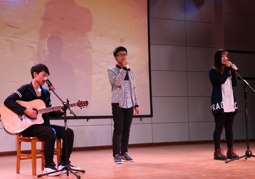 经过初赛和复赛的选拔,共有10位歌手登上了决赛舞台。决赛实行两轮决胜制,第一轮演唱励志歌曲,采用评委举牌方式决定进入第二轮人选,第二轮演唱红歌,采用评委打分方式评定选手成绩。在决赛的舞台上,歌手们有的自弹自唱,有的邀请乐队伴奏,有的配以朗诵,有的采伴唱伴舞,有的运用话剧情节;有的突出声音特色,有的注重演唱技巧,有的讲究情感融入。大家八仙过海,各显其能,为现场观众呈现了一场视听盛宴。比赛现场掌声、欢呼声此起彼伏,气氛热烈。经过第一轮的较量,7名同学参加了第二轮角逐。经过评委打分,刘景灏同学以一曲声情并茂的《映山红》打动评委和现场观众,夺得第一名,第二、三名被李楚眸同学和郑靖宇同学获得。李聪同学获得最佳人气奖。