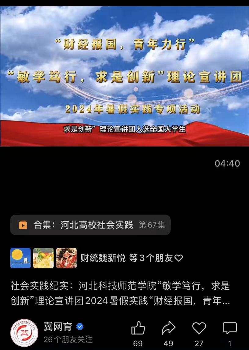 体育365官网“敏学笃行,求是创新”理论宣讲团2024暑假实践“财经报国,青年力行”专项活动,采用集中宣讲和分散宣讲的形式奔赴秦皇岛经济技术开发区第二小学和秦皇岛北戴河区戴河镇路北社区北戴河艺术村进行理论宣讲。在此过程中团队成员不断自我提升,自我完善,通过不断思考、学习、实践,拓宽视野,增长知识,提升能力。(编辑:路荞华  审核:于秀敏)