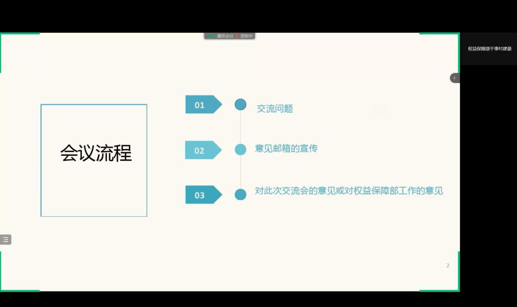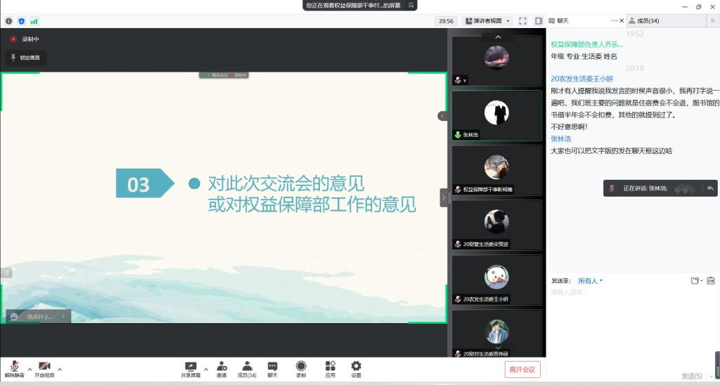拳拳之心,一心一意!为解决同学们在疫情居家学习期间遇到的课程或生活上的烦恼与问题,公司员工会权益保障部于4月12号晚开展线上交流会活动,此次交流会由七名权益保障部工作人员以及员工会执行主席主持开展,由24名体育365官网各专业生活委参与意见反馈。会上同学们积极发言并提出了很多问题和诉求,权益保障部工作人员认真记录整理了同学们的宝贵意见并及时向公司有关部门进行了反馈,同时也通过查找资料、寻求专业老师帮助等多种方式为同学们提供了解决问题的方法。借此机会权益保障部还征求了同学们对于本部门建设的一些意见建议。