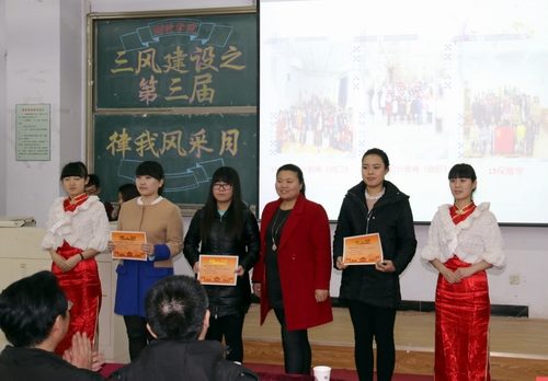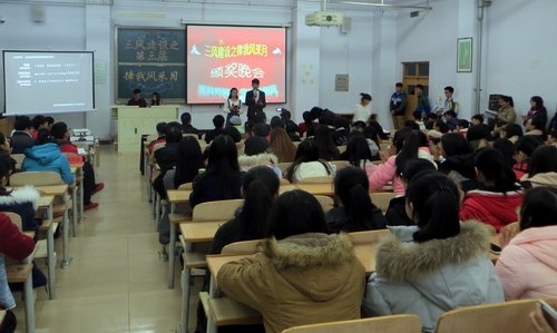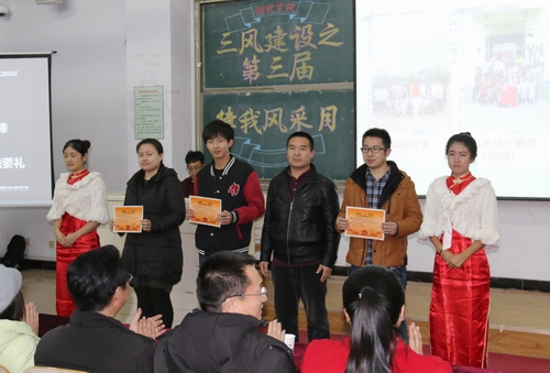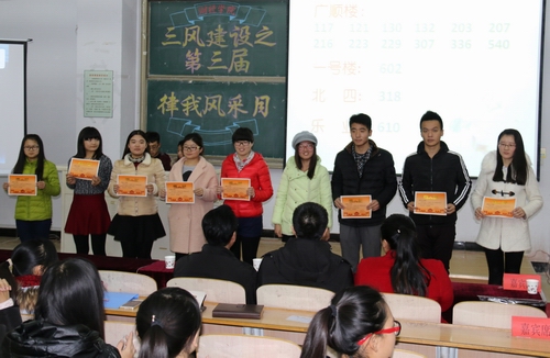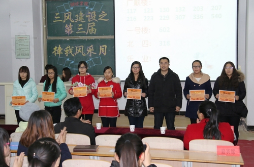 2015年12月10日晚,在逸夫楼B104 教室举办了总结和颁奖。获奖班级代表和员工代表分别介绍经验。公司主管领导、辅导员班主任参加晚会并为获奖单位和个人颁奖。