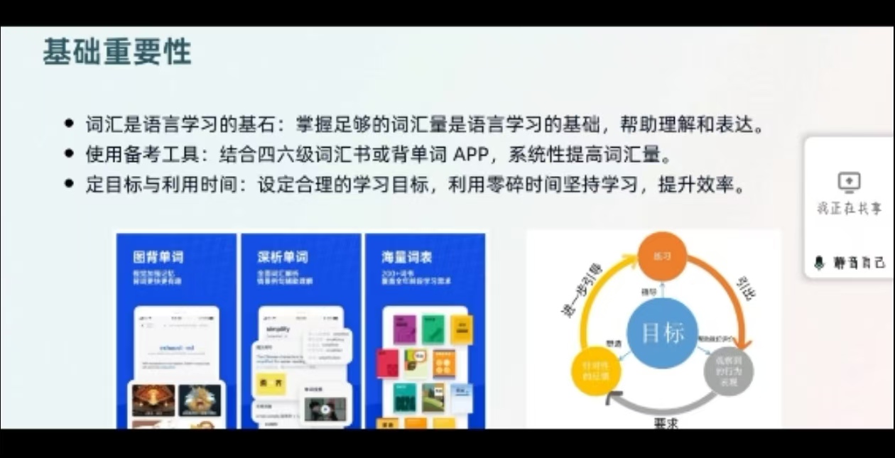 首先,秦梦萱从四六级英语备考进行分享。秦梦萱结合自身的备考经历以及多年的四六级考题钻研经验,从词汇积累、听力训练、阅读技巧、写作与翻译等方面为同学们提供了全方面的备考建议。在词汇积累方面,秦梦萱讲到单词背诵的重要性,在平日里利用碎片化时间和高效的学习app达到事倍功半的效果。在听力训练方面,她强调要学会总结题型,多听多练。在阅读理解方面,秦梦萱分享了自己多年来做题中总结出的应对技巧,能够在做题中提高准确率。在写作与翻译方面秦梦萱分享了写作框架的重要性,建议同学们在考前熟悉各种常见的作文类型,掌握基本的写作结构,平日中多积累写作素材。