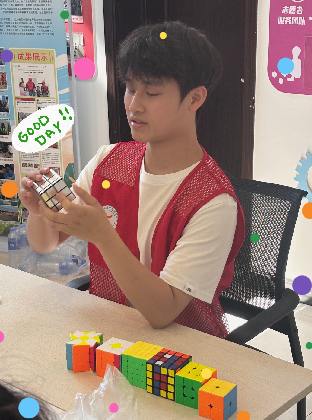 活动首日,实践团队的老员工辅导员们以“趣味魔方”课程拉开实践序幕。面对充满好奇的青少年,辅导员们从最基础的三阶魔方结构讲起,用生动的比喻将“棱块”“角块”比作“积木伙伴”,帮助孩子们理解魔方构造。课堂上,辅导员们手把手示范“十字还原法”,耐心纠正手势细节,还设计了“魔方接力赛”“最快还原挑战”等小游戏。从最初的手足无措到逐渐掌握技巧,孩子们的脸上渐渐洋溢起成就感。“原来魔方一点都不难!我现在能独立还原一面啦!”第二天课程结束后,社区青少年小林举着魔方兴奋地说。两天的魔方教学不仅锻炼了孩子们的空间思维能力,更在轻松的氛围中培养了专注力与耐心。