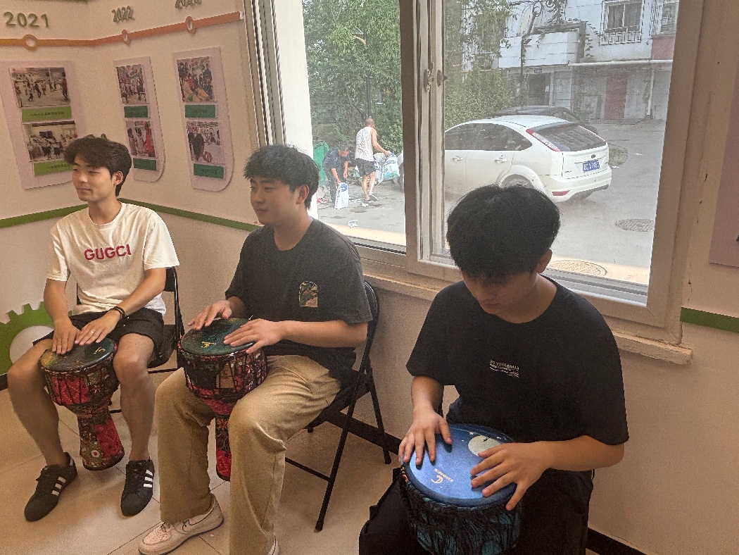 实践活动第五天,充满活力的“非洲鼓教学”成为收尾亮点。老员工辅导员们带着色彩鲜明的非洲鼓来到课堂,先通过一段热情的鼓乐表演点燃气氛,随后从鼓面分区、基本节奏型教起,用“咚——哒啦——”的口诀帮助孩子们掌握节拍。课堂上,孩子们跟着辅导员的示范拍打鼓面,从零散的节奏到整齐的合奏,欢声笑语与鼓点声交织成欢乐的乐章。“非洲鼓不用认谱也能玩,太有趣了!”孩子们在分组合奏中体验着协作的快乐,也感受着多元文化的魅力。