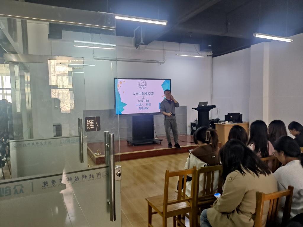 讲座伊始,杨波向同学们详尽地阐释了注册个体工商户和企业所需提交的材料、注册流程以及应注意的事项,并将网上注册过程的截图制作成PPT,以便同学们更直观地掌握网上注册的具体步骤。随后,杨波分享了他对创新创业的独到见解和多年来的创业经历与心得。在讲座的尾声阶段,杨波邀请优秀创业者苟志凡和常凯旋来分享他们的创业经验和心得。苟志凡率先进行了分享,她详细介绍了其所在团队开展的创业项目,以及在项目推进过程中所取得的创新成果。常凯旋则着重针对自己在创新创业历程中所遇到的一系列问题展开了深入剖析,并且贴心地告知同学们应当如何有效避免这些问题的发生。