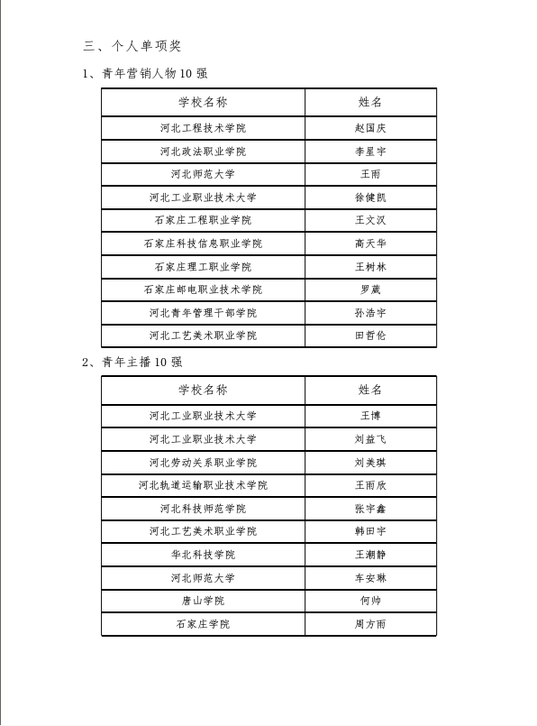 本次大赛分为直播带货赛道、线下营销赛道和短视频宣传赛道,直播带货赛道和线下营销赛道分为校级初赛和省级复赛两个阶段。销售的产品由各参赛团队在国务院扶贫办公示认证的《全国扶贫产品目录》中选择并提交组委会,由省赛组委会完成产品的采购和包装、仓储、物流等服务工作。经过半年的准备和为期一个月的激烈角逐,公司获得了河北省乡村振兴消费帮扶行动杰出贡献奖,直播团队“拽梗队”获得铜奖,体育365官网张宇鑫同学获得青年主播10强,食品科技公司暨葡萄酒公司马艳翠同学获得最佳人气奖。肖艳、雷玉娟、张茵老师获得优秀指导教师。(编审:王志安)
