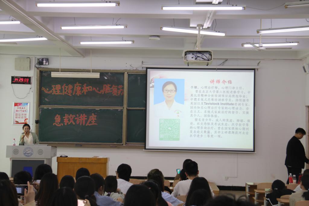 急诊科负责人刘宇薇,讲解了心肺复苏急救讲座知识,包括呼吸困难、昏迷、咯血、发热、急性胸痛、休克及中枢神经系统急症等的处理,向师生普及心肺复苏急救知识,为健康生活进行科学指导。