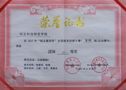 2017年11月29日,2017年“税友衡信杯”全国税务技能大赛本科组总决赛在浙江省杭州市滨江区海创园举行,来自全国25个省份70所本科院校的师生参加角逐,体育365官网参赛团队获得三等奖。