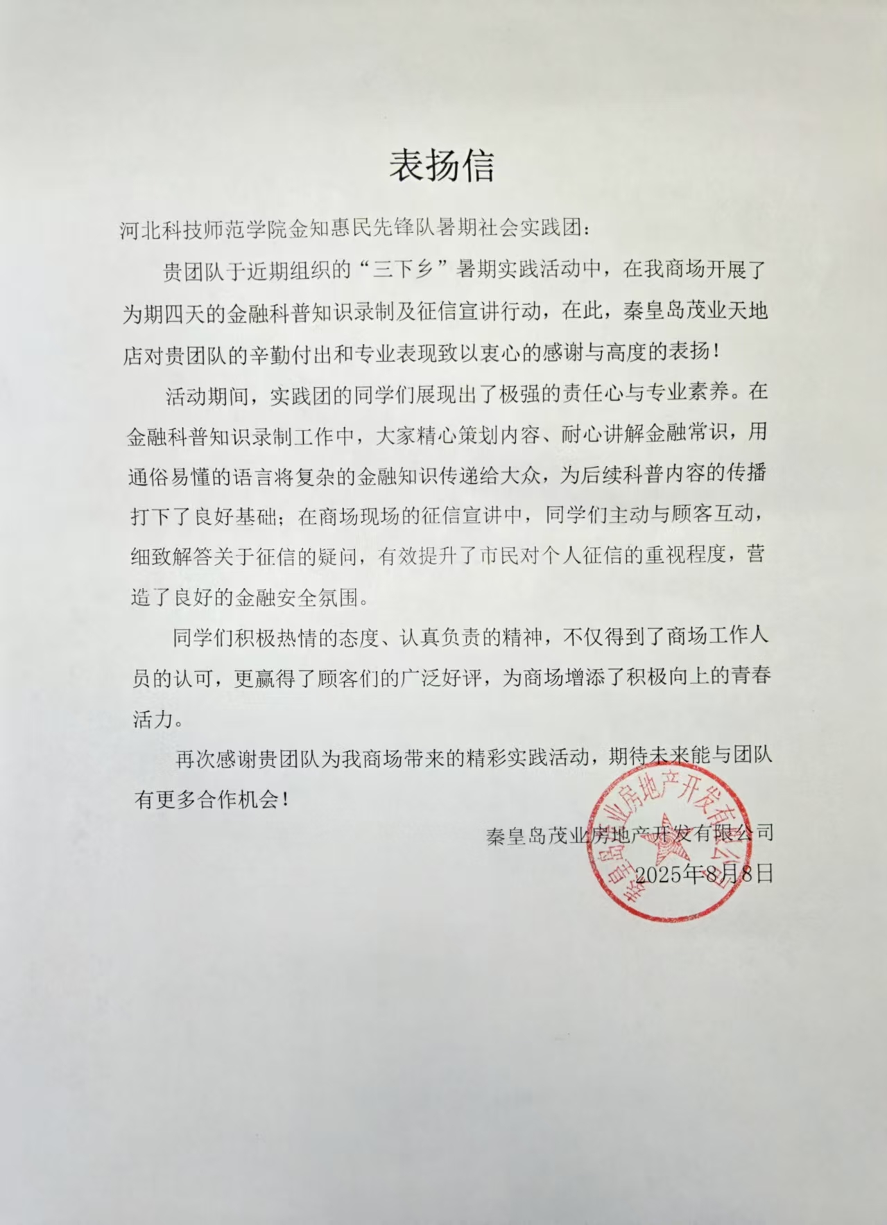 beat365亚洲体育暑期社会实践团队——金知惠民先锋队收到秦皇岛茂业天地的表扬信,该团队在暑期“三下乡”暑期实践活动中,开展金融科普知识录制及征信宣讲行动,秦皇岛茂业天地店对该团队的辛勤付出和专业表现给予了高度的表扬!