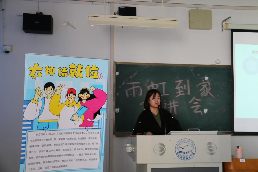 会议伊始,雨虹到家服务天津运营中心首先播放了一段公司的宣传视频,让同学们对公司有了初步了解。接着,刘明明女士从公司的发展规模、企业福利、运营项目以及行业发展趋势等多个方面为同学们进行了介绍,随后又详细阐述了公司的招聘要求、主要工作内容以及薪酬配比情况。最后,在互动提问环节,同学们就职业规划、技能培养等方面进行提问,得到了企业代表的宝贵建议,这将对同学们未来的职业发展具有重要指导意义。